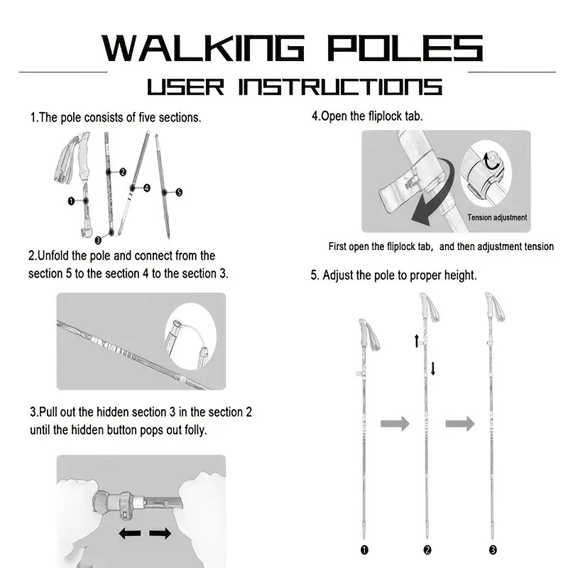 5-Section Collapsible Hiking Poles – Ultra-Lightweight & Adjustable Trekking Poles for Mountain Climbing & Hiking�� The Ultimate Support for Your Outdoor Adventures!Engineered for hikers, climbers, and backpackers, these 5-section collapsible trekking poles offer superior stability, comfort, and portability. Made from aircraft-grade aluminum alloy, they feature an external locking system and ergonomic EVA grips to reduce fatigue on long trails.