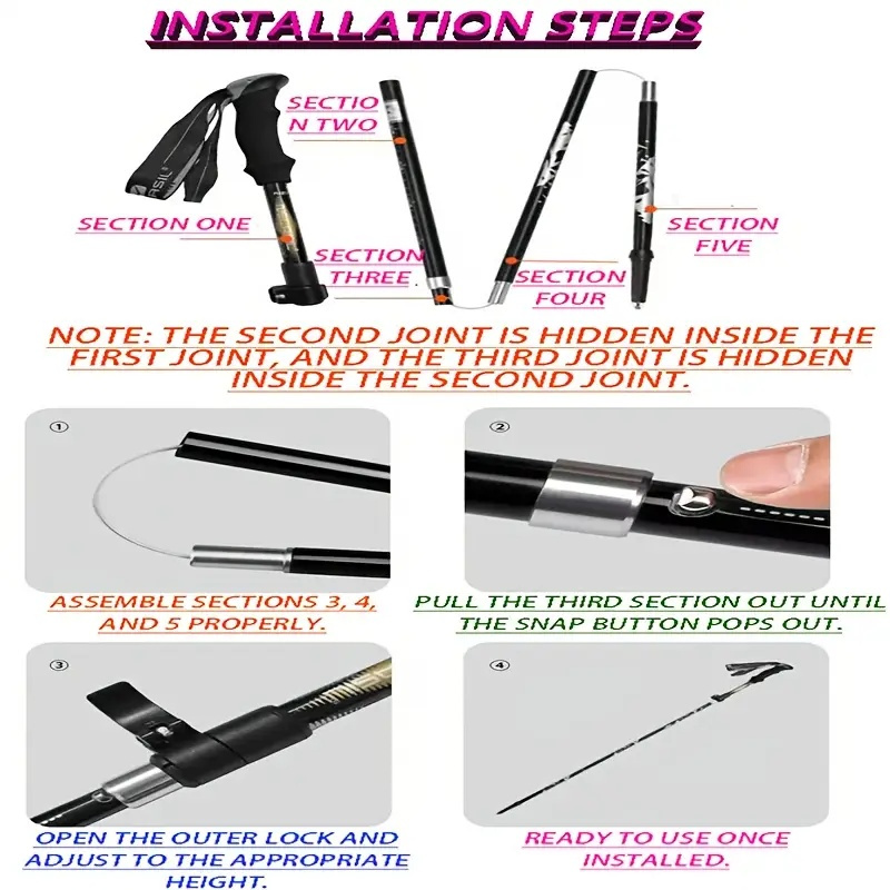 5-Section Collapsible Hiking Poles – Ultra-Lightweight & Adjustable Trekking Poles for Mountain Climbing & Hiking�� The Ultimate Support for Your Outdoor Adventures!Engineered for hikers, climbers, and backpackers, these 5-section collapsible trekking poles offer superior stability, comfort, and portability. Made from aircraft-grade aluminum alloy, they feature an external locking system and ergonomic EVA grips to reduce fatigue on long trails.